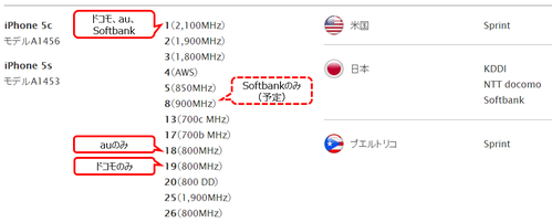 NTTドコモ、au、SoftbankのLTEサービスのBand(周波数帯)とiPhone、iPadの各モデルのBand(周波数帯)の組み合わせ表は、こちら